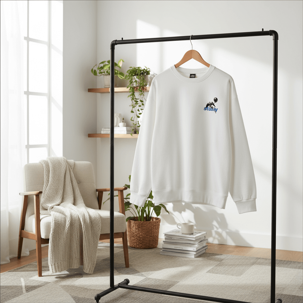 Stussy White Crewneck Sweatshirt in soft cotton, front mini print, back skull wings and 8-ball graphic with blue logo, unisex streetwear style, breathable comfort for daily casual outfits.