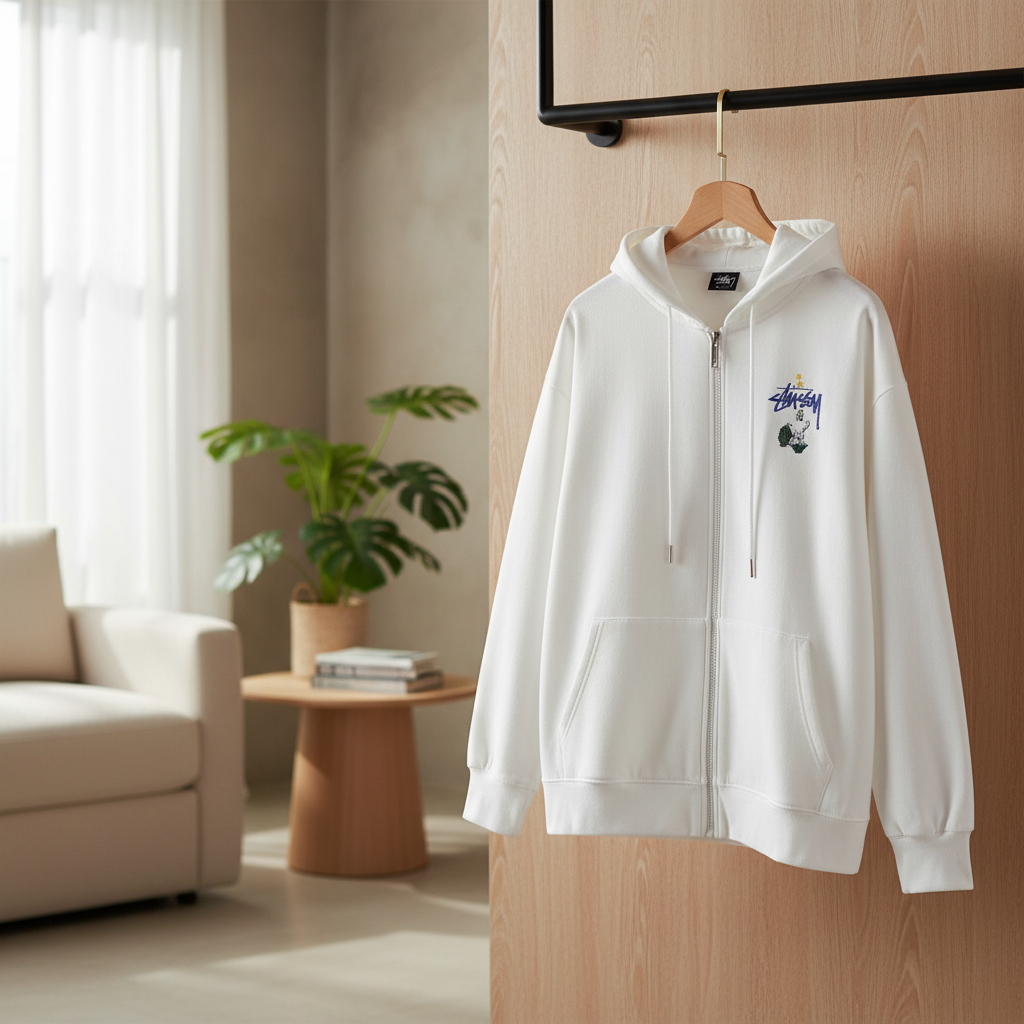 Stussy White Zip Hoodie crafted from soft breathable cotton, features front mini logo, back graffiti cactus print, drawstring hood, kangaroo pocket, unisex streetwear for casual cool style.