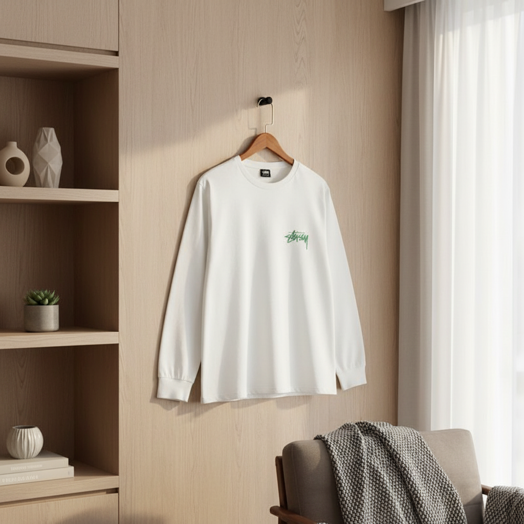 Stussy White Street Style Long Sleeve T-Shirt, made of premium breathable cotton, features a small front logo and bold green & black back print, unisex design for daily casual wear and trendy urban look.