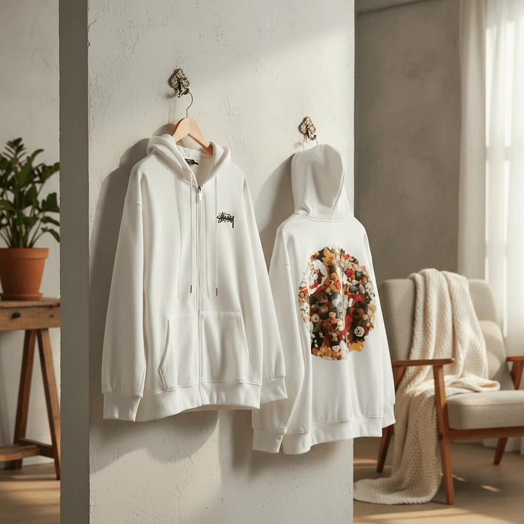 Stussy White Zip Hoodie, soft cotton fabric with logo on front and colorful plush ball circle on back, drawstring hood, kangaroo pocket, unisex streetwear style, comfy and trendy.
