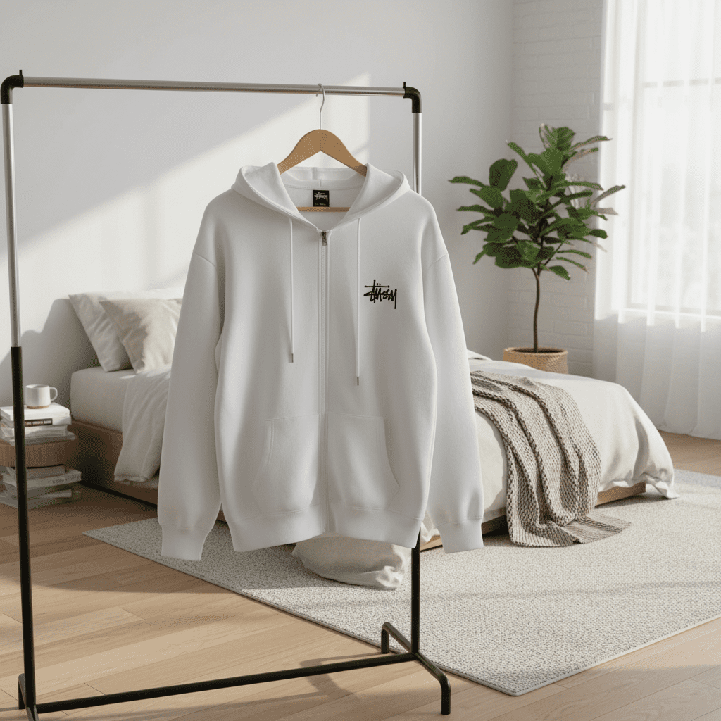 Stussy White Zip-Up Hoodie made from soft breathable cotton, featuring iconic graffiti logo, adjustable drawstring hood, practical kangaroo pocket, unisex streetwear for daily casual style.