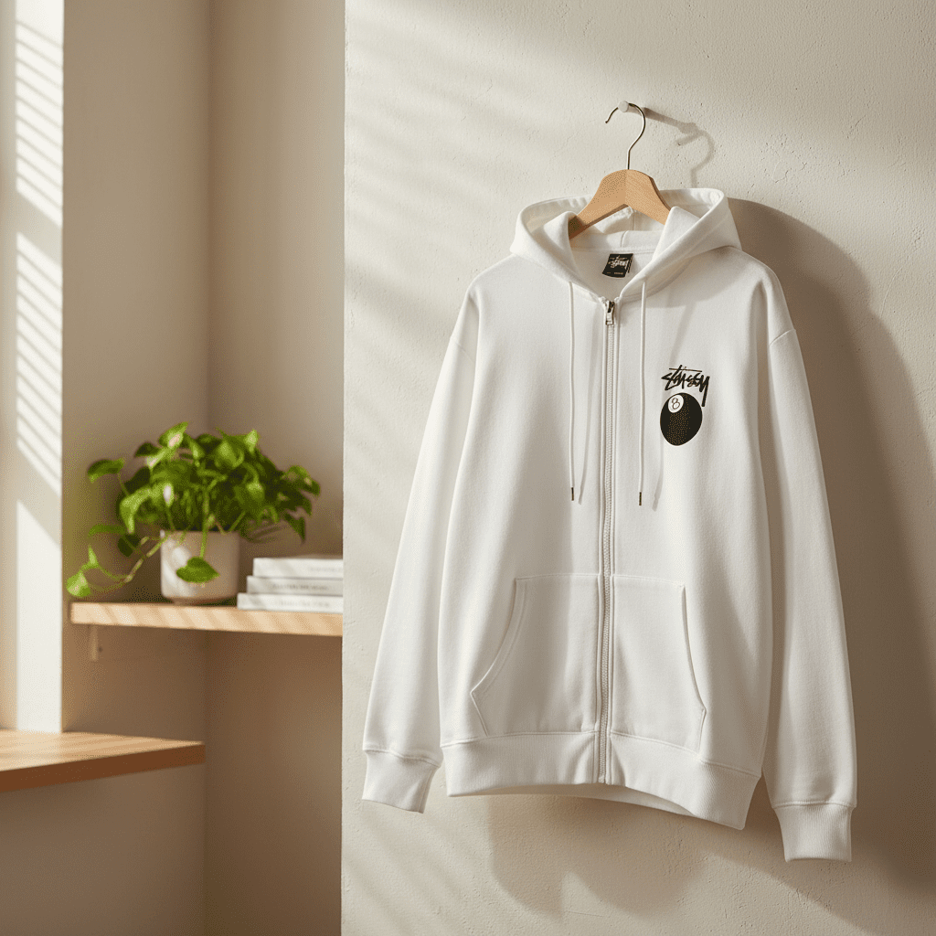 Stussy White Zip-Up Hoodie, soft cotton fabric for comfort, graffiti logo and 8-ball graphic on chest, drawstring hood, front kangaroo pocket, unisex streetwear style, perfect for daily casual wear.