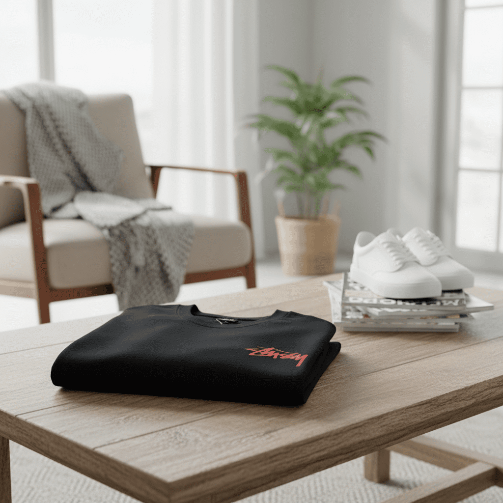 Stussy Black Cotton T-Shirt, soft and breathable, featuring red logo on front and cartoon wizard with star elements on back. Unisex streetwear style for casual, trendy everyday looks.