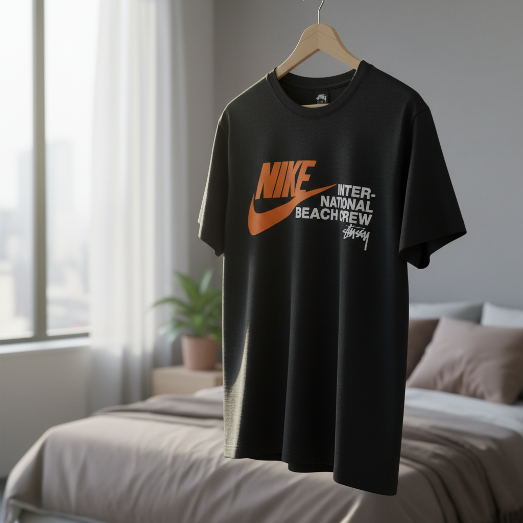 Stussy x Nike Black Cotton T-Shirt featuring orange Nike swoosh and white graphic text, breathable streetwear style for men and women, perfect for daily wear and urban fashion looks.