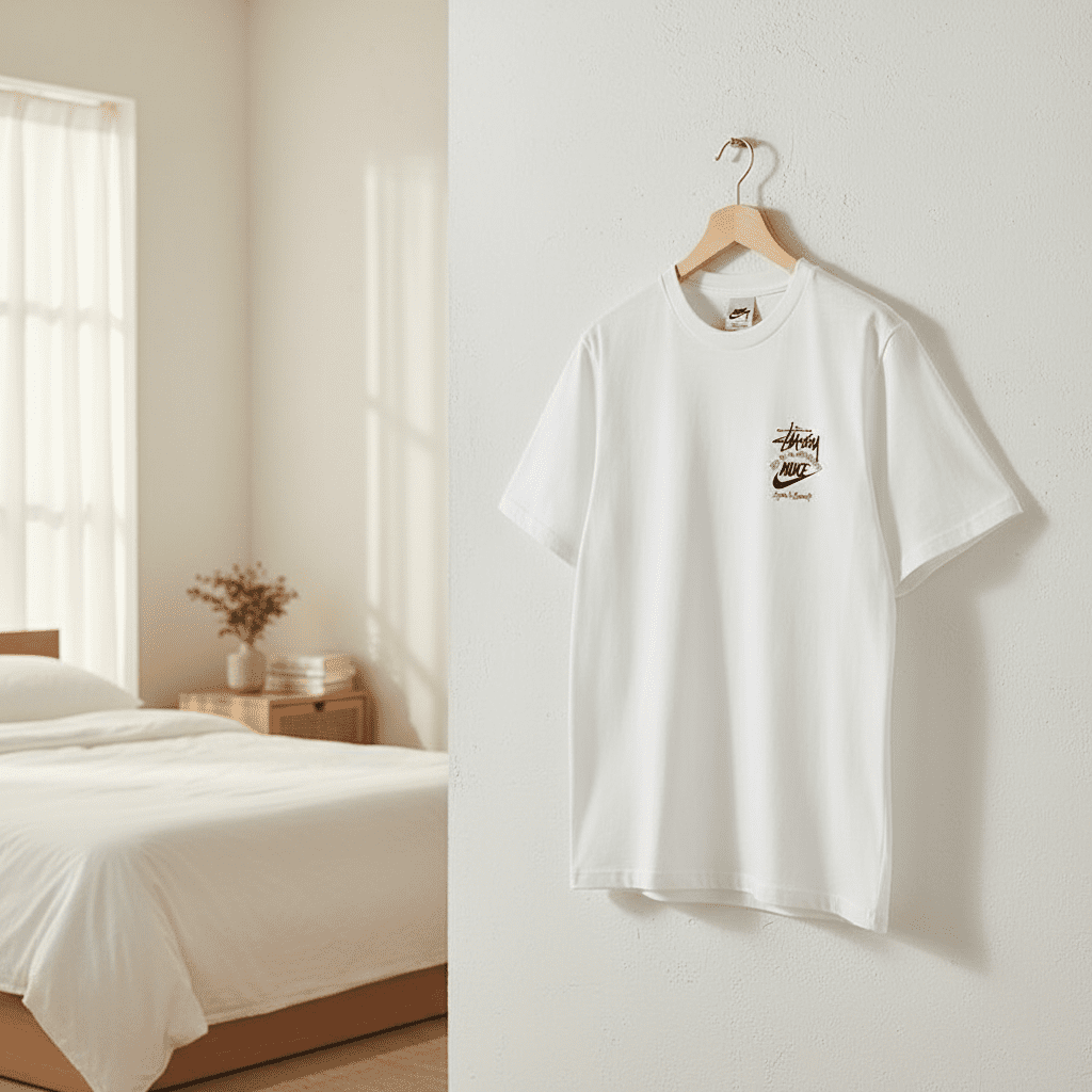 Stussy x Nike White Cotton T-Shirt, breathable and comfy, front mini Nike logo, back Stussy graffiti print, streetwear style, unisex fit, perfect for expressing bold and modern fashion attitude.