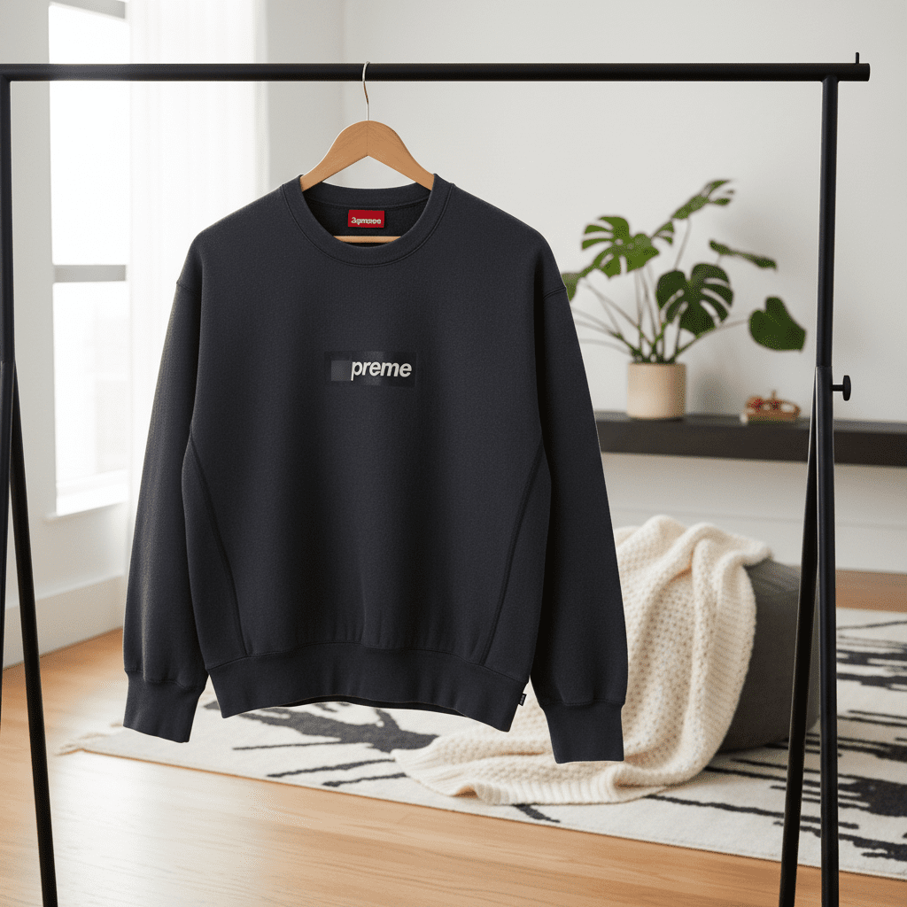 Supreme dark blue crewneck sweatshirt made from soft cotton fabric, featuring signature logo print, unisex streetwear design, perfect for daily casual and fashion-forward looks.
