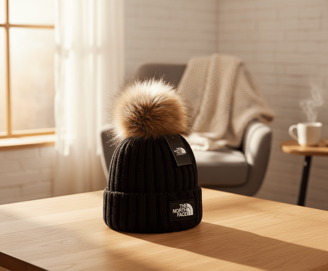 The North Face black knitted winter hat with real fur pom pom, soft warm knit fabric, front logo, stylish outdoor casual design, unisex, perfect for autumn and winter daily wear and outdoor activities.