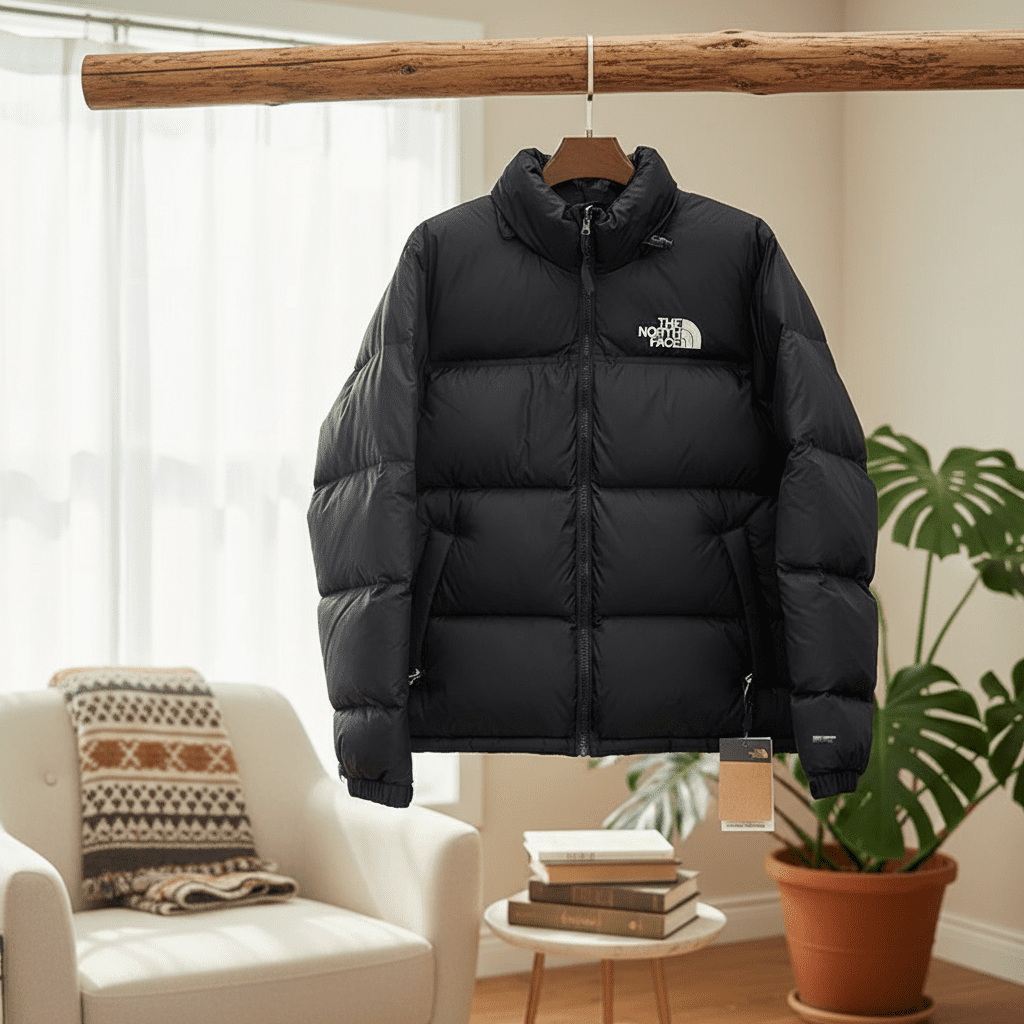 The North Face Classic Black Down Jacket, windproof fabric with full down filling, stand collar zip design, outdoor casual style, unisex, warm and stylish for daily and outdoor wear.