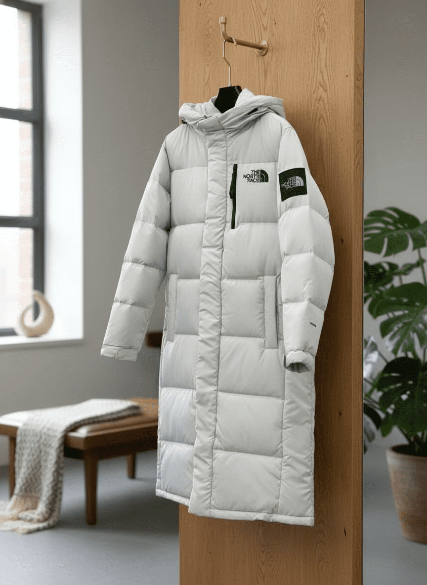 The North Face Light Gray Long Hooded Down Jacket, windproof and insulated fabric with quilted design, chest pocket, logo detail on sleeve, unisex outdoor style for fall and winter.