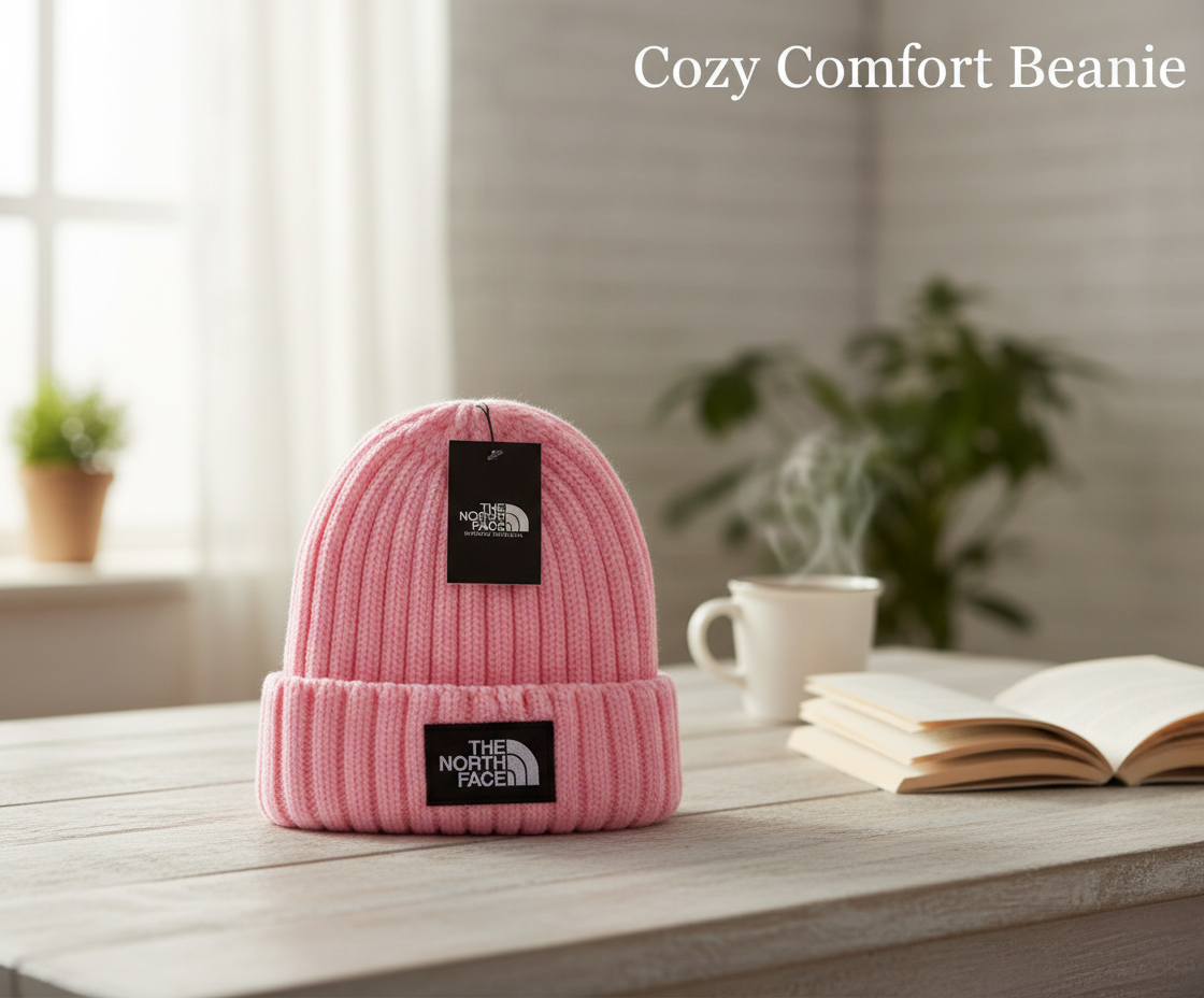 The North Face Pink Knit Beanie: Soft ribbed fabric for cozy fit, iconic logo patch at front, stylish and warm for men and women, ideal for daily wear and light outdoor activities.