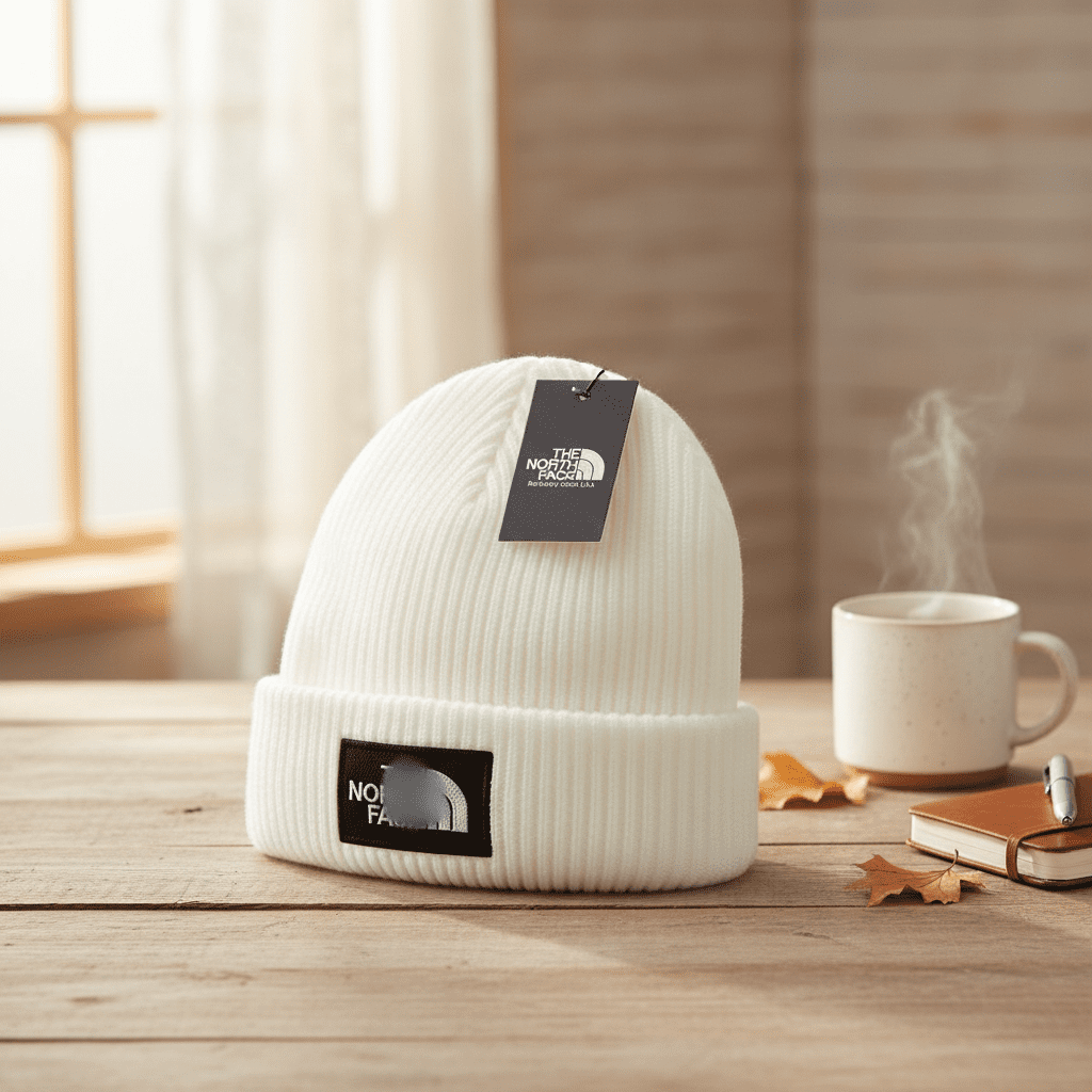 The North Face White Ribbed Knit Beanie – Soft and warm material, classic black logo patch, unisex outdoor casual style, perfect for daily wear and cold weather adventures.