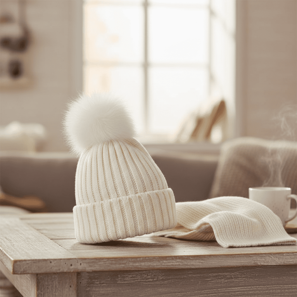 The North Face off-white knitted beanie, soft and skin-friendly fabric, fluffy white pom on top, bold black logo patch, ribbed design fits snugly, unisex outdoor style combining warmth and fashion.