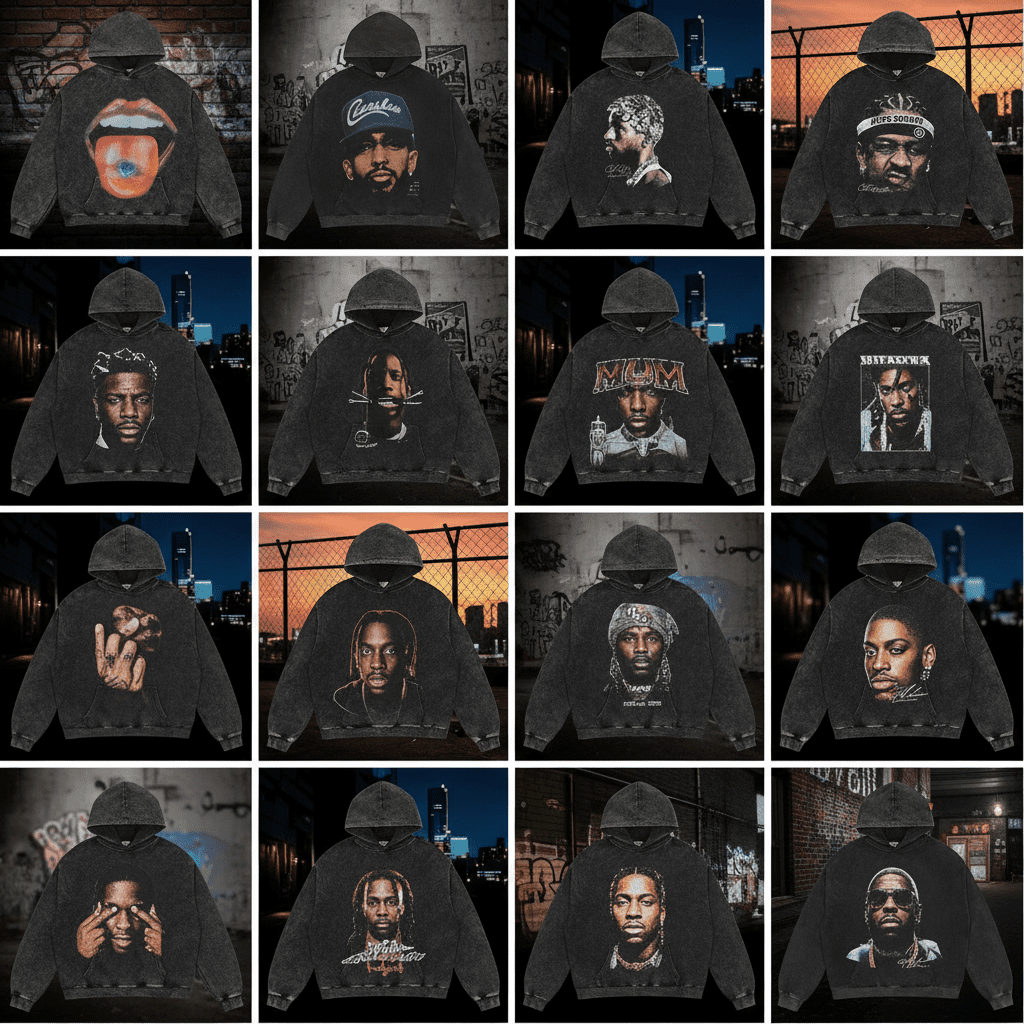 Discover trendy black washed hoodie with unique prints—portraits, lips, eyes & more. Cotton, relaxed fit, perfect for streetwear. Stand out effortlessly!