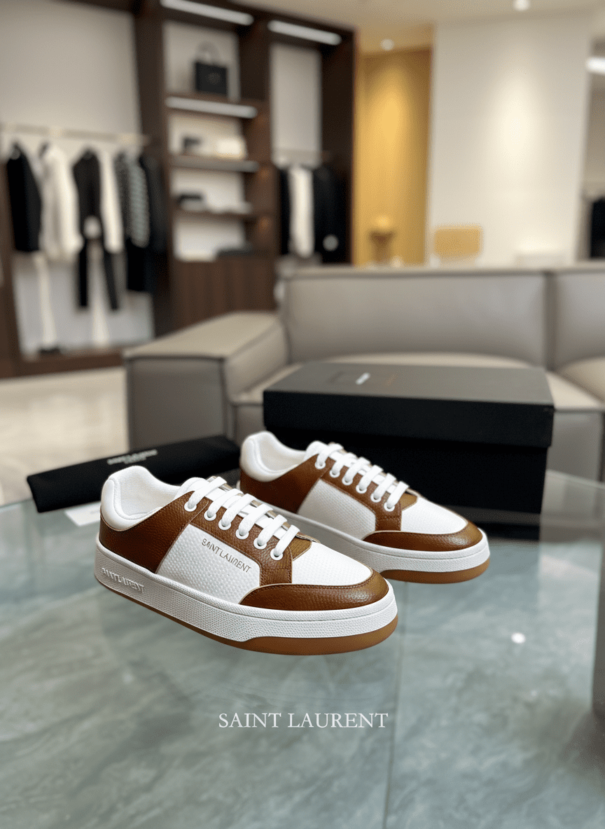 YSL Saint Laurent SL80 Sneakers Premium Cowhide White & Camel Unisex